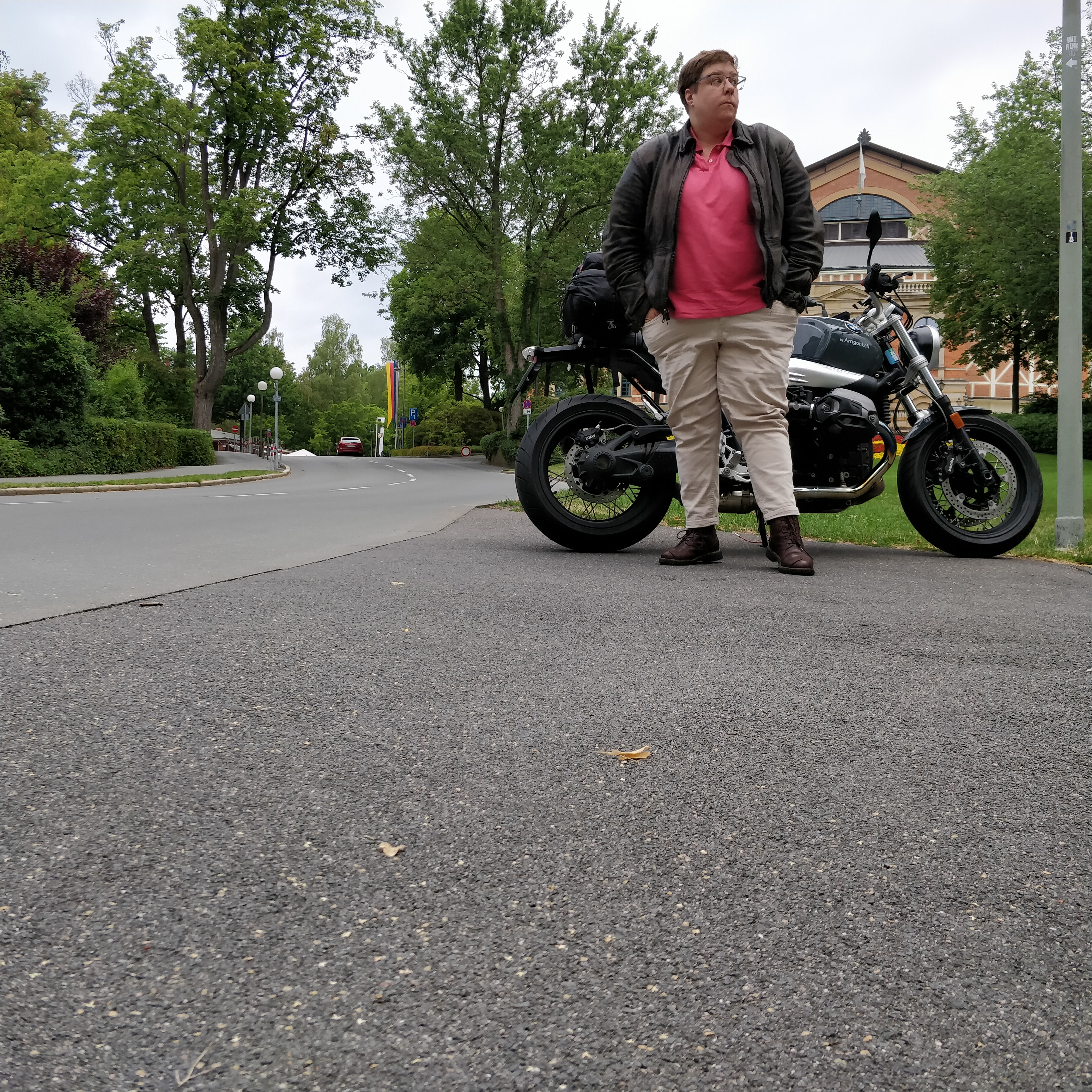 I did get some sideways looks at my motorcycle boots. (I am also especially self-conscious having recently learned that only Americans wear brown shoes with suits of any color.) But also at moto parking in Salzburg last night a late-50s guy in a tuxedo – or to the Germans, ein Smoking – straddled his Vespa, his wife in cocktail dress jumped on behind, saw me tucking my program under the pillion strap of the beemer and gave me a quick expression of camaraderie.